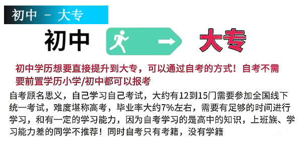 那么初中學(xué)歷能不能直接升大專呢?首先說(shuō)一下沒(méi)有前置學(xué)歷要求的大專,那就是自學(xué)考試,自考形式大專目前對(duì)于你之前是否有學(xué)歷是沒(méi)有什么要求的,所以無(wú)論是小學(xué)、初中,還是高中都可以報(bào)考自考大專。但是不是一個(gè)好選擇呢?其實(shí)盛老師是不建議大家報(bào)自考的,因?yàn)?5%以上的上班族是沒(méi)有那么多閑暇時(shí)間去自學(xué)考試的。大家都知道自考特別的難,考試科目也多,每一科都不簡(jiǎn)單,所以沒(méi)有時(shí)間、沒(méi)有精力學(xué)習(xí)又怎么能考過(guò),即便是沒(méi)有前置學(xué)歷要求,你考試考不過(guò)也沒(méi)辦法拿到畢業(yè)證書。據(jù)權(quán)威機(jī)構(gòu)統(tǒng)計(jì),全國(guó)自考通過(guò)率僅為10%-30%,什么概念?十個(gè)人可能只能通過(guò)一個(gè),最多也就通過(guò)三個(gè),其他人都拿不到自考畢業(yè)證書。那有沒(méi)有其他形式了呢,實(shí)際上大多數(shù)地區(qū),如果你初中畢業(yè)滿3年了,是可以用于報(bào)考成人高考大專的,雖然說(shuō)也需要參加全國(guó)統(tǒng)一成人高考考試,但這考試的難度相對(duì)要比自考簡(jiǎn)單很多了,通過(guò)率可以達(dá)到90%以上。但不是所有地區(qū)初中都可以報(bào)成考的,部分地區(qū)要求必須高中或中專才可以。