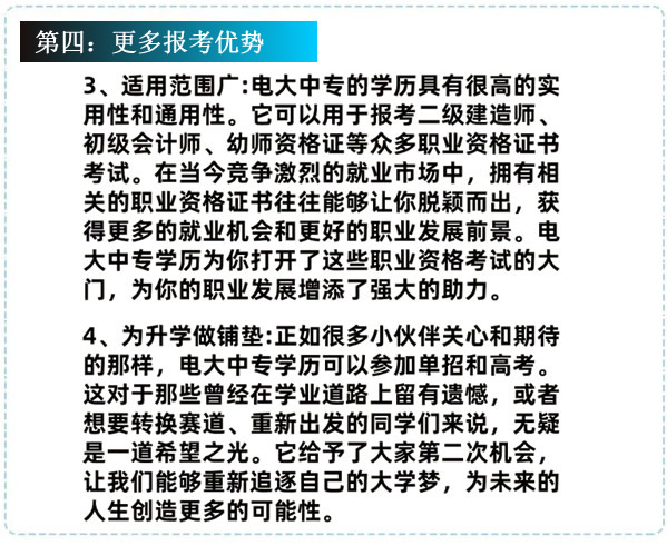 中專最主要的兩個應用方向就是考取資格證書和作為報考大專學歷前置學歷,而電大中專開設的專業更加的實用,無疑是年滿18周歲提升中專學歷的首選。