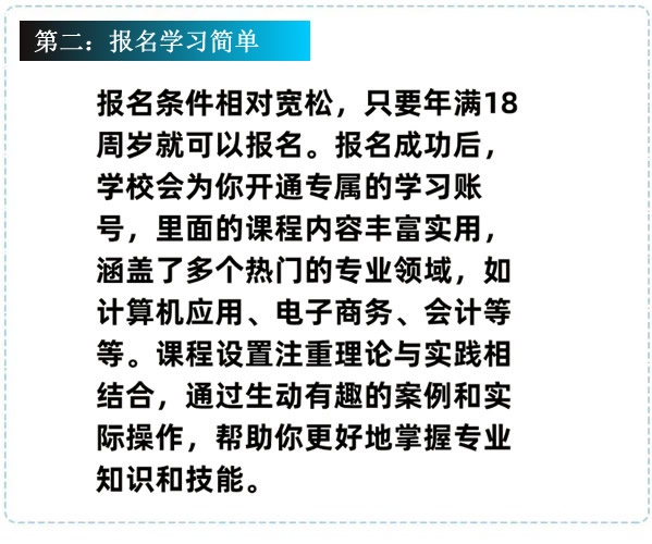 想要報名電大中專學歷的朋友,并不需要擔心自己不符合報考條件,因為只要年滿18周歲就能報考,至于怎么選擇學制和專業看你自己的具體用途而定了,當然如果你沒有高中學歷,但又不想出現學歷斷層,那么就需要選擇兩年制。而學習方式上則更加貼近成年人的需求了,無需面授,全程線上,甚至可以做到從報名到畢業拿證全程線上完成。所以報考電大中專的同學不用擔心自己因為沒有時間學習考試而無法畢業。